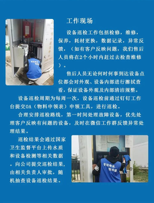 本公司社区售水机采用九级过滤,高效净化系统,有效去除重金属和有害物质等;同时保留了自来水里含有的矿物质,安全升级。售后人员根据用水量每月定时更换滤芯,定期维护,保障机器安全有效运转。怡水源和您的共同守护家人的用水健康,我们立志做到让每一位消费者在社区都能享受到健康好水!