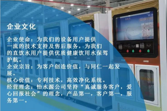 北京怡水源环保科技有限公司,成立于2010年8月,是一家专业致力于公共饮水设备、家居净水设备、工业水处理设备的研发、生产、配件、销售、售后维护、直营、六位一体的实业公司。产品具有生产许可证,卫生部颁布的卫生许可证;并已通过ISO9000质量认证。怡水源全国净水设备全线产品投放中国市场以来,得到了国家主管部门、权威机构和有关专家的一致认可,并荣获其颁发的各种荣誉证书、奖状和奖牌。